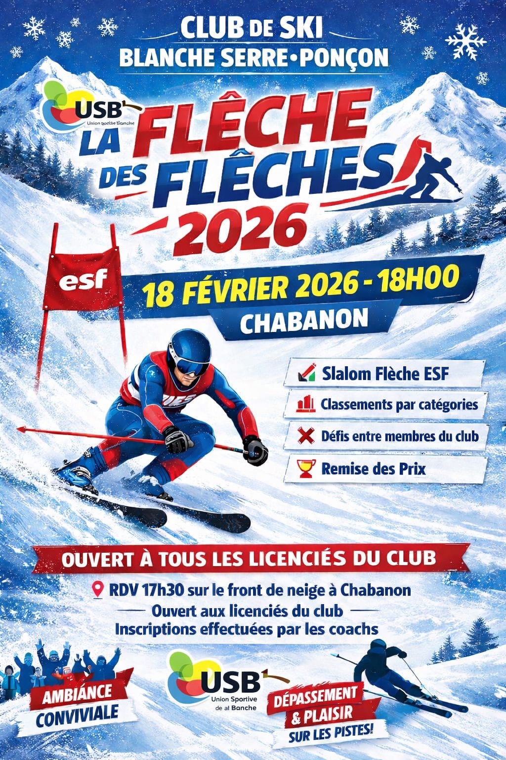 Le Club de Blanche Serre-Ponçon organise cette année encore son grand rendez-vous hivernal : la Flèche des Flèches, l’épreuve qui réunit tous les passionnés du ski et met à l’honneur la progression technique de nos jeunes comme de nos adultes.