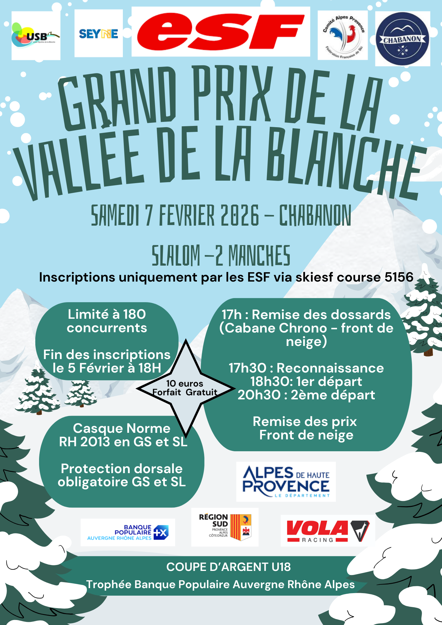 Le Club de Ski USB Blanche Serre-Ponçon, en partenariat avec l’ESF de Chabanon et le Comité Alpes Provence, a le plaisir d’accueillir le Grand Prix de la Vallée de la Blanche 2026.