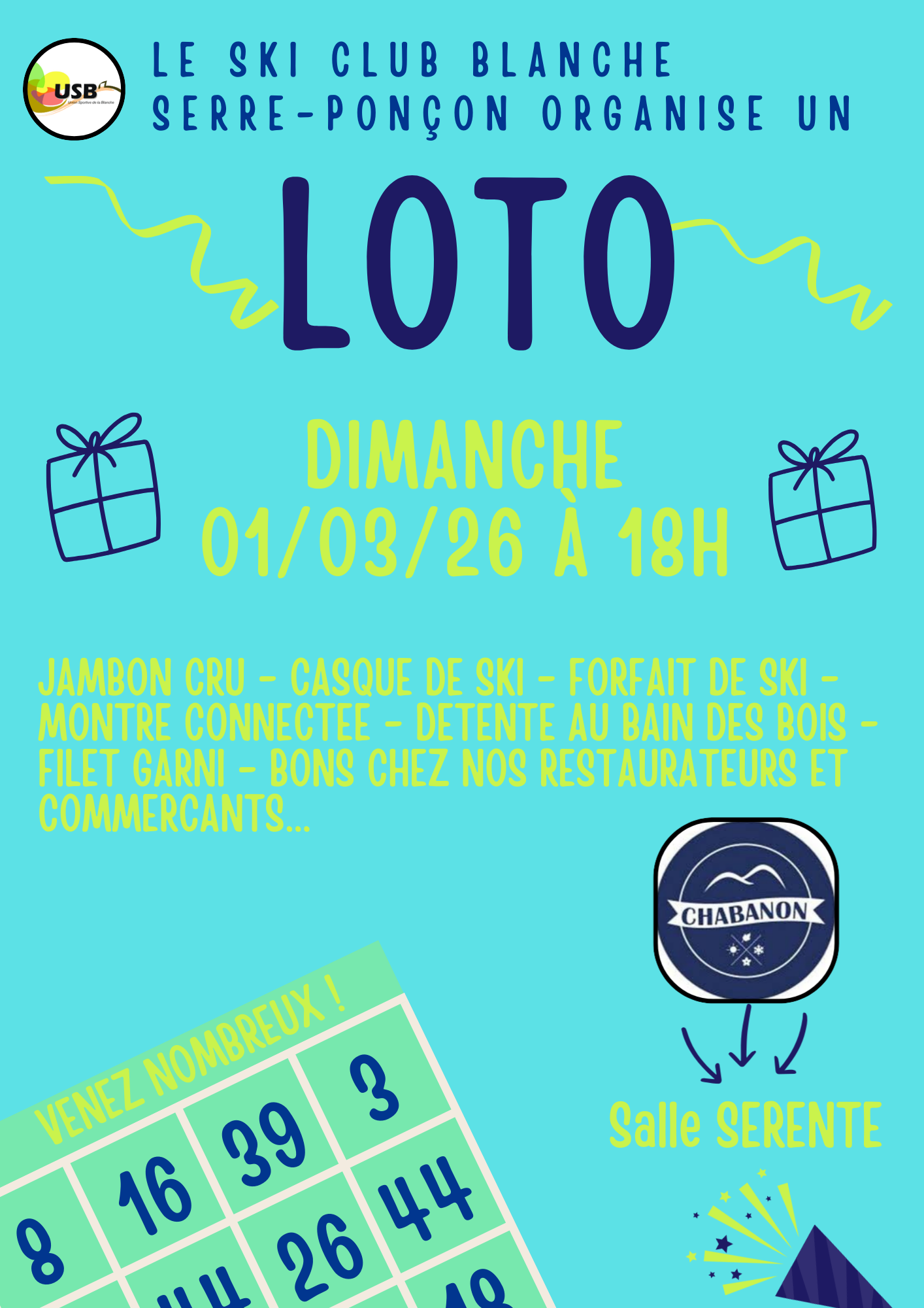 Le Ski Club Blanche Serre-Ponçon est heureux de vous inviter à son grand loto annuel, qui aura lieu le dimanche 1er mars 2026 à 18h, à la salle Serente – Chabanon.